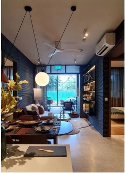 This thoughtfully designed 1-bedroom unit features an elegant dining area with a marble feature wall and integrated TV, a cozy living room adorned with a curved designer sofa and a gallery wall, and a media room perfect for entertainment. The layout maximizes space and comfort, ensuring a seamless flow throughout. Enjoy the luxury of a large lap pool and a heritage-style clubhouse, all set within beautifully manicured lawns and fountains.