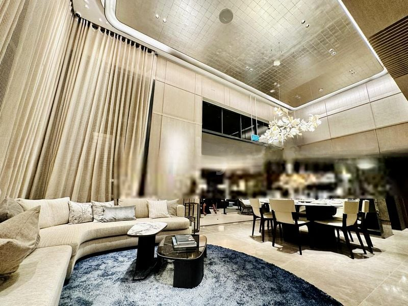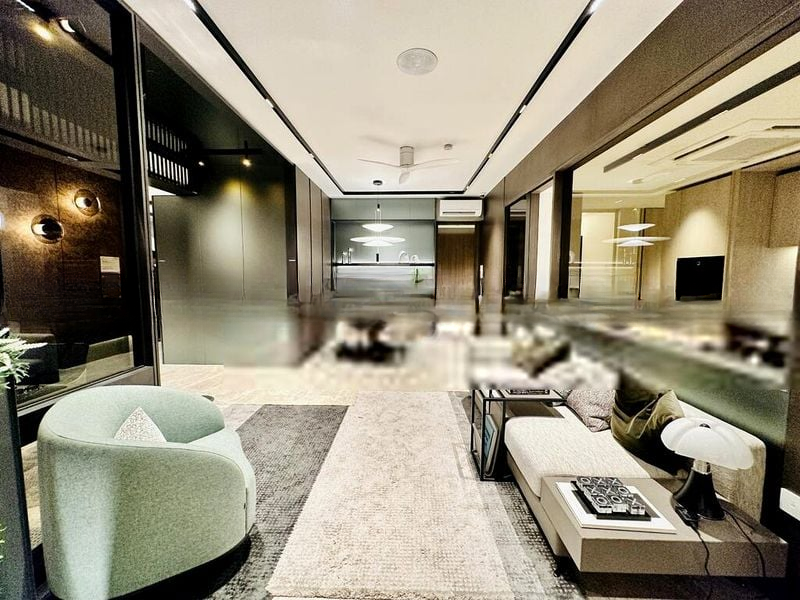 Step into a world of modern luxury where abundant natural light floods through floor-to-ceiling windows, illuminating the exquisite finishes of this brand-new designer unit. The harmonious blend of wood-paneled walls, marble-look feature walls, and coffered ceilings creates an inviting ambiance, while the stunning views of lush greenery and the city skyline elevate the living experience.