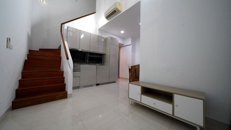 Step into a world of modern elegance as you enter this beautifully renovated unit at The Centren. The abundant natural light floods the open-concept living space, accentuating the loft-style high ceiling and polished tile flooring. A stunning wooden staircase with a glass railing invites you to explore further, while the urban views from the balcony create a vibrant backdrop for your daily life.