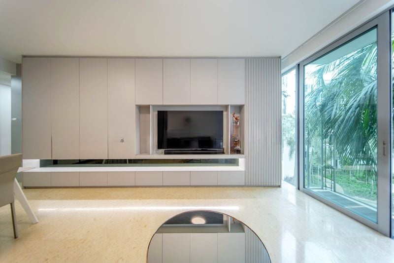 Step into a world of modern elegance where abundant natural light floods through floor-to-ceiling windows, illuminating the exquisite marble-look flooring and fluted wall panels. The open-concept living and dining area invites you to unwind, offering stunning views of the swimming pool and landscaped courtyard, creating a serene ambiance that feels like a private retreat.