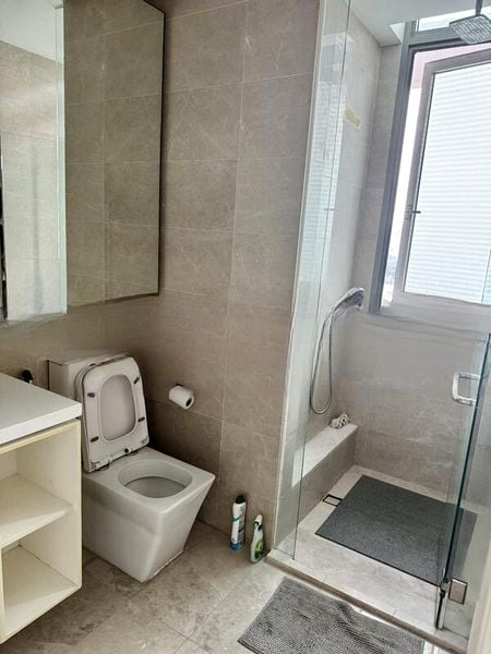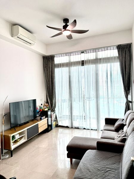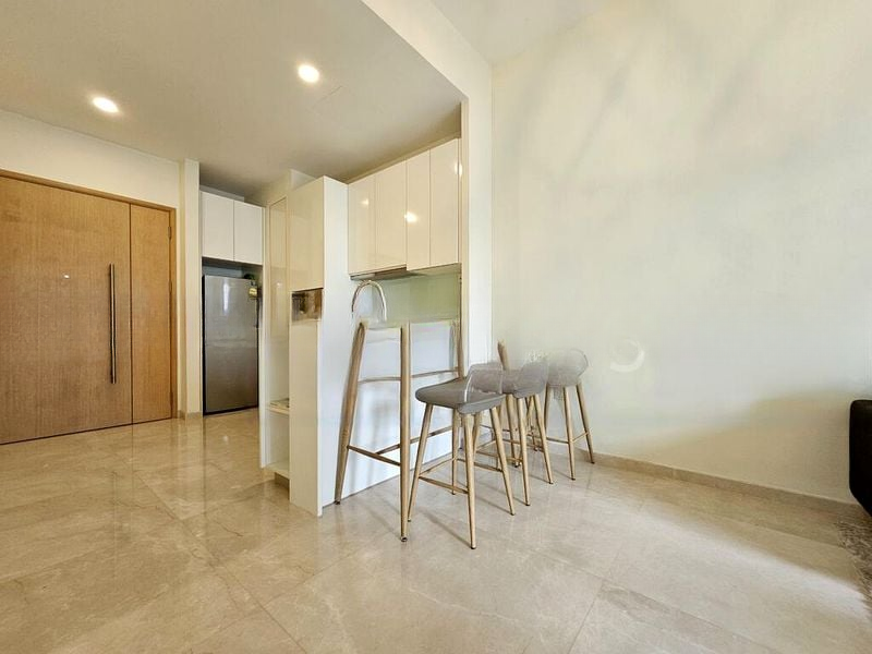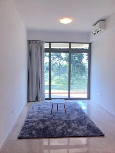 Step into a modern minimalist haven where abundant natural light floods the open-concept living space, accentuating the sleek marble-look floor tiles and the striking brick feature wall. Large sliding glass doors invite you to the balcony, where you can unwind on artificial turf while soaking in the serene views of greenery and the vibrant city skyline.