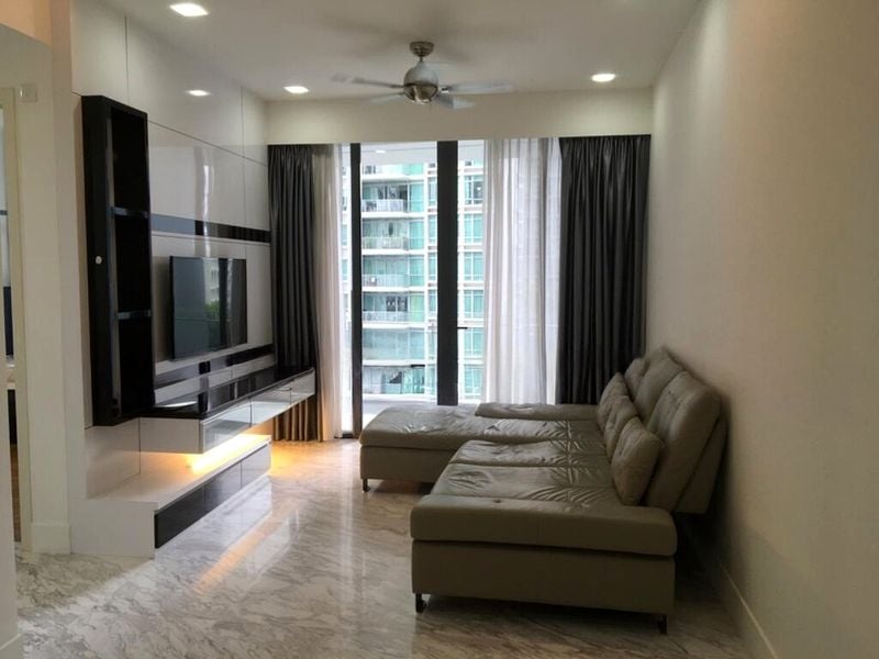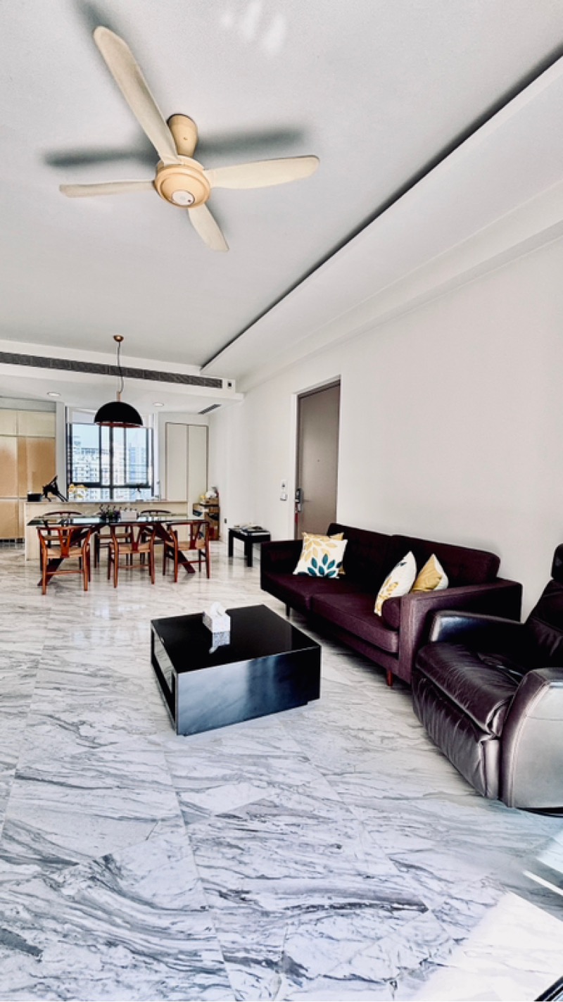 Step into this stunning 3-bedroom unit at VIVA, where abundant natural light floods the open-concept living space, highlighting the exquisite marble flooring and a striking patterned feature wall. The airy ambiance invites you to relax and enjoy the panoramic city skyline views from the balcony, complete with a glass railing that enhances the sense of openness.