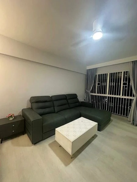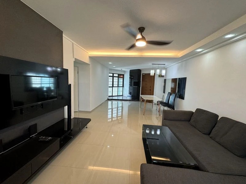 Step into a beautifully renovated haven where modern minimalism meets functionality. The moment you enter, you are greeted by the soft glow of cove lighting, highlighting the polished floor tiles and the inviting dark feature wall in the living room. Natural light filters through the space, creating a warm ambiance that complements the urban views of surrounding HDB blocks.