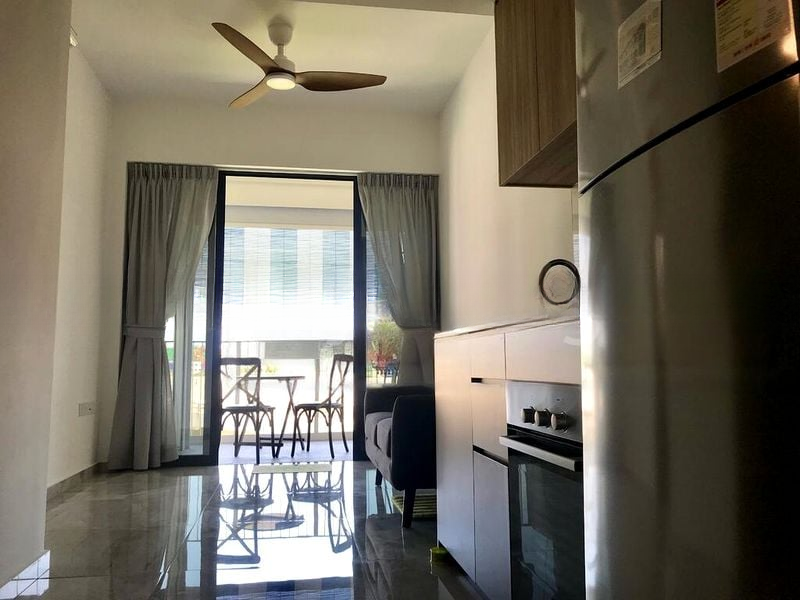 Step into a world of modern elegance as you enter this well-maintained 1-bedroom unit at The Verandah Residences. The abundant natural light floods the open-concept living area, highlighting the polished floor tiles and the distinctive striped facade that sets this property apart. Enjoy serene views of the port and greenery from your balcony, perfect for unwinding after a long day.