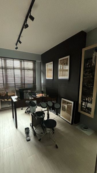 Step into this beautifully renovated HDB flat and be greeted by a striking modern industrial ambiance, accentuated by herringbone wood flooring and designer accent walls. The natural light filters through sheer and blackout curtains, creating a warm and inviting atmosphere in the living room, where a dark blue accent wall adds depth and character.