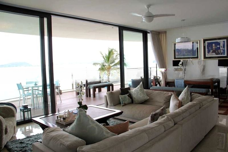 Step into a world of luxury as you enter this stunning 4-bedroom unit at Cape Royale, where abundant natural light floods the space through floor-to-ceiling glass windows. The massive curved balcony, adorned with dark wood decking, offers unobstructed panoramic views of the shimmering sea, landscaped gardens, and the inviting swimming pool, creating a serene ambiance that feels like a private resort.
