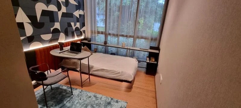 Step into a world of modern luxury as you enter this brand-new unit at ONE BERNAM. Bathed in abundant natural light, the open-concept living area features a striking marble TV feature wall and elegant grey marble-look floor tiles that create an inviting ambiance. The panoramic city skyline views from the balcony, complemented by a vertical green wall, offer a serene escape amidst the urban landscape.