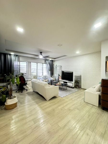 Step into this beautifully renovated HDB flat, where modern minimalist design meets functionality. The living room greets you with a full-height built-in TV console and cove lighting that creates a warm ambiance, complemented by white tiled flooring that enhances the spacious feel. Natural light filters through, offering a cozy yet contemporary atmosphere, while views of neighboring residential blocks provide a sense of community.
