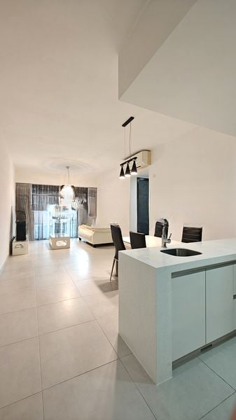 Step into a world of modern elegance as you enter this beautifully renovated unit at The Rochester Residences. The open-concept living area greets you with a striking white leather sofa and a unique geometric coffee table, bathed in natural light from large windows. The ambiance is enhanced by designer pendant lights that create a sophisticated yet inviting atmosphere.