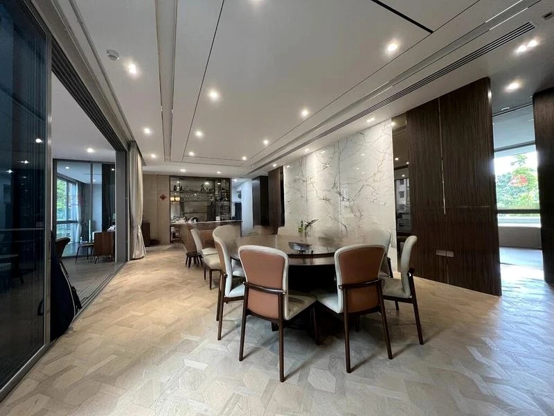 Step into this stunning 4-bedroom unit at Meyerhouse, where abundant natural light floods the open-concept living and dining areas, accentuated by a striking marble feature wall and elegant patterned wood flooring. The airy ambiance invites you to unwind, while the spacious balcony with wooden decking offers a serene outdoor retreat, perfect for alfresco dining amidst lush greenery and neighboring views.