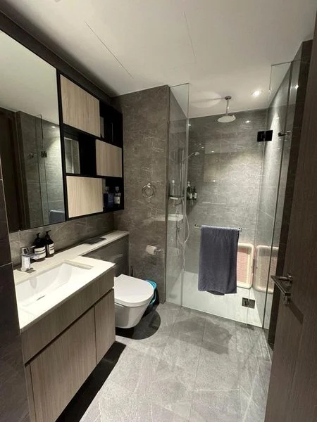 This well-maintained 1-bedroom unit features standout elements such as a stylish platform bed, high ceilings, and a luxurious rain shower in the bathroom. The open-concept kitchen and living area boast sleek black cabinetry and polished finishes, while the dedicated study area with a live-edge wooden desk offers a perfect blend of functionality and aesthetic appeal. Every detail, from the built-in shoe cabinets to the designer pendant lights, has been thoughtfully curated for a sophisticated lifestyle.