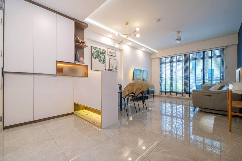 Step into a beautifully renovated 2-bedroom flat where modern elegance meets functional design. The open-concept living room greets you with its inviting ambiance, enhanced by track and cove lighting that casts a warm glow across the space. Natural light filters through full-height curtains, highlighting the stylish breakfast bar and the chic kitchen island adorned with two-tone cabinetry.