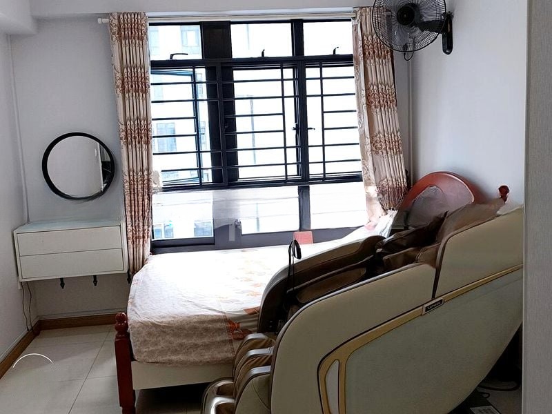 This efficient layout boasts a well-appointed galley kitchen featuring built-in appliances, including a stainless steel refrigerator, alongside a dedicated household shelter and service yard. The master bedroom offers a serene retreat with wood-look flooring and an integrated study/vanity desk, while the modern bathroom showcases a glass shower partition and a sleek vessel sink with a black vanity.
