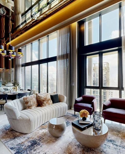 This exquisite 5-bedroom, 5-bathroom unit boasts an open-concept layout that seamlessly connects the living and dining areas. The living room features a stunning curved sofa and a marble-textured TV wall, while the dining area showcases a designer green dining table beneath a sparkling crystal chandelier. Each bedroom is thoughtfully designed with wood-paneled feature walls and expansive windows, ensuring that every corner of this home is filled with style and comfort.