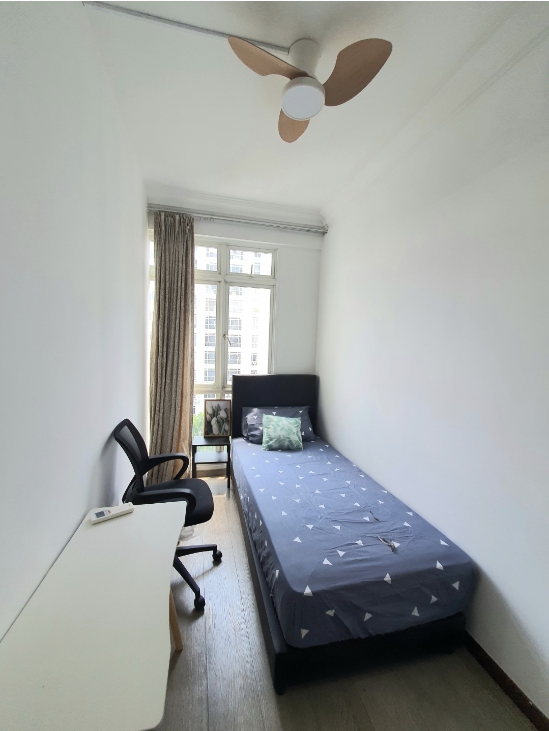 This well-maintained 1-bedroom unit features a fully-furnished interior, including a comfortable single bed adorned with patterned bedding, a dedicated study desk for productivity, and a stylish sliding door wardrobe with sleek black accents. The living space is complemented by a three-blade wooden ceiling fan and wall-mounted air conditioning, ensuring comfort throughout the year. Enjoy the luxury of landscaped gardens and a large swimming pool just steps from your door.