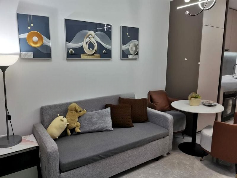 This brand-new 1-bedroom unit boasts a thoughtfully designed layout that maximizes space and functionality. The integrated kitchen features sleek handle-less cabinetry, an induction hob, and a built-in oven, perfect for culinary enthusiasts. The bedroom, with its warm wooden laminate flooring and quilted headboard, creates a cozy retreat, while the bathroom showcases full-height marble-effect tiling and a luxurious rain shower, elevating your everyday experience.