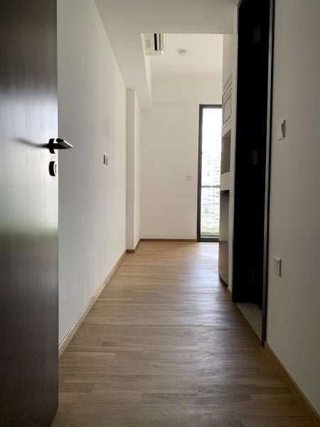 This thoughtfully designed unit features a modern kitchen with wood-look cabinetry, built-in oven, and a mobile kitchen island cart, ideal for culinary enthusiasts. The master bedroom boasts wood-look laminate flooring and direct greenery views, while the bathrooms are equipped with luxurious rain showers and contemporary fixtures, ensuring comfort and style.