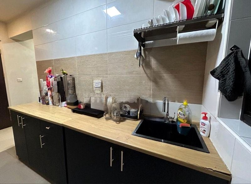 This well-maintained unit features three spacious bedrooms, each equipped with ceiling fans and designed for comfort. The custom platform bed in the master bedroom offers clever storage solutions, complemented by an integrated study desk and floor-to-ceiling wardrobes. The seamless layout ensures easy access to the ensuite bathroom, making this home perfect for modern living.