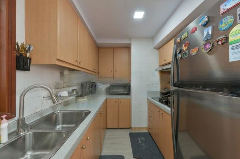 The layout is thoughtfully designed, showcasing a galley kitchen with wooden cabinetry and a large refrigerator, perfect for culinary enthusiasts. The master bedroom boasts wood flooring, a built-in dressing table, and a ceiling fan, ensuring comfort and convenience. Additional highlights include built-in wardrobes in the bedrooms and a utility area equipped with a washing machine, catering to modern living needs.