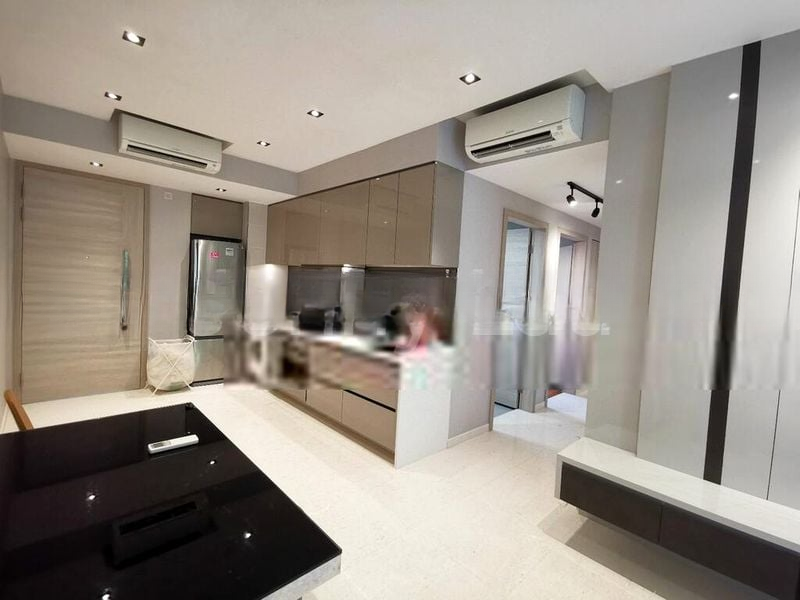 Step into a world of modern minimalist elegance as you enter this brand-new 2-bedroom unit at Sophia Hills. Bathed in abundant natural light, the open-concept living space features designer finishes, including a striking dark accent wall and sleek track lighting, creating an inviting ambiance. The glass balcony railings offer a seamless connection to the greenery outside, enhancing the tranquil atmosphere.