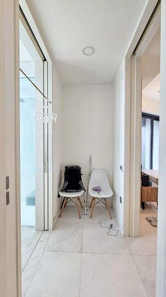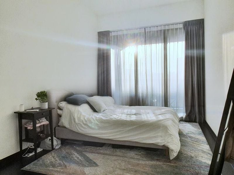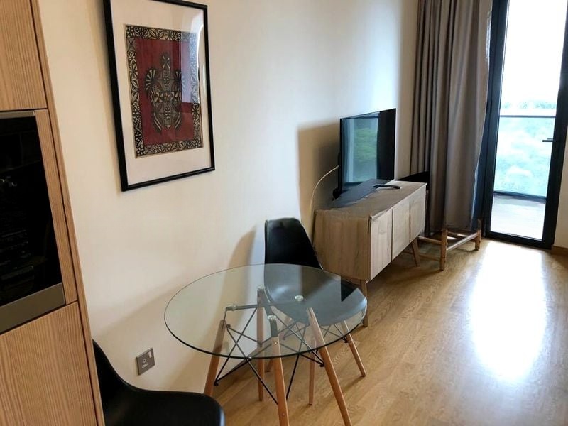 Step into a bright and airy sanctuary at DUO Residences, where abundant natural light floods the open-concept living space through floor-to-ceiling sliding glass doors. The polished tile flooring enhances the modern ambiance, while the expansive private terrace offers stunning views of greenery and the urban landscape, perfect for relaxation or entertaining.