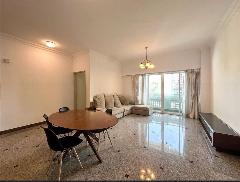 Step into a sanctuary of light and space in this beautifully maintained 3-bedroom unit at Royal Palm Mansions. The polished stone flooring with diamond accents greets you, while abundant natural light streams through sliding glass doors, illuminating the bright and airy living and dining area. Enjoy serene views of the swimming pool and lush greenery from your balcony, creating a perfect backdrop for relaxation.