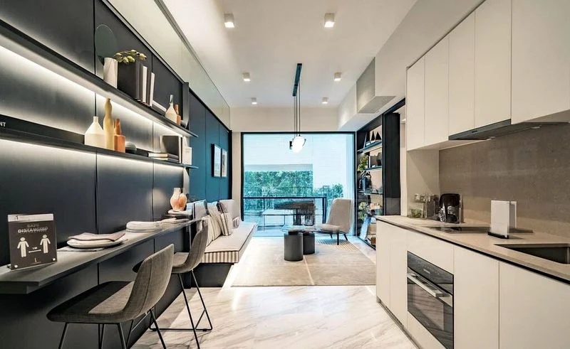 This efficient 2-bedroom layout boasts standout features including a master bedroom with a built-in vanity and textured wall paneling, and a second bedroom equipped with bunk beds and an integrated study desk. The galley kitchen is fitted with integrated appliances and flows seamlessly into the living and dining areas, perfect for entertaining. Step out onto the balcony, where a wooden pergola and lush perimeter planting provide an ideal outdoor dining space.