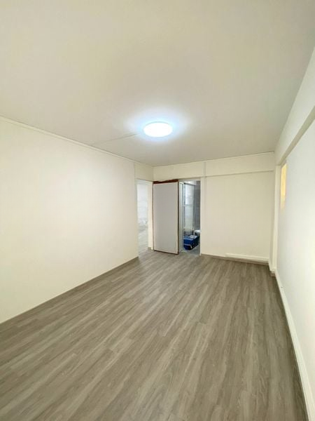 Step into this brand-new, modern minimalist flat where the fresh white paint and new wood-look vinyl flooring create a bright and inviting atmosphere. The spacious open layout of the living and dining area is accentuated by multiple ceiling lights and an elegant arched doorway, inviting you to experience a sense of freedom and comfort.