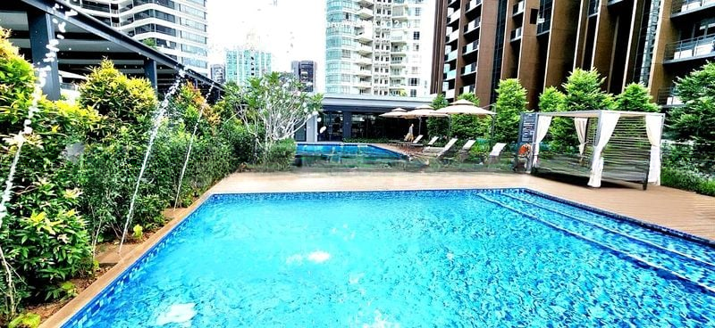 Step into a world of elegance as you enter this stunning 2-bedroom unit at Pullman Residences Newton. The abundant natural light floods through floor-to-ceiling windows, illuminating the polished marble flooring and creating a bright, airy ambiance. Enjoy the breathtaking city skyline views from your private balcony, complemented by a decorative floral chandelier that adds a touch of sophistication.