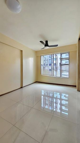 Step into this bright and airy 1-bedroom flat, where abundant natural light floods through large windows, creating a warm and inviting ambiance. The polished tile flooring and the modern black ceiling fan add a touch of elegance, while the views of neighboring residential blocks provide a sense of community and tranquility.