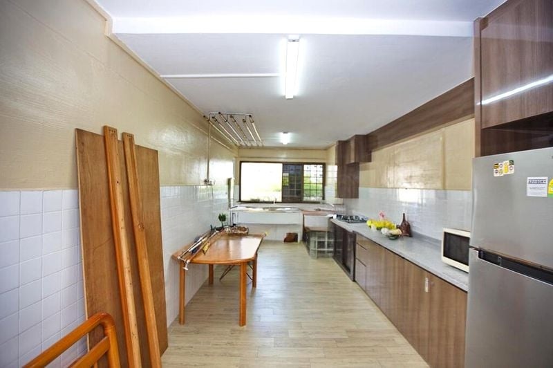 The layout features a generous living room perfect for family gatherings, complemented by a well-appointed kitchen and two comfortable bedrooms. The master bedroom boasts a soothing pink feature wall and a padded headboard, while the second bedroom offers ample natural light. With original finishes, this unit presents a unique opportunity for personalization and renovation.