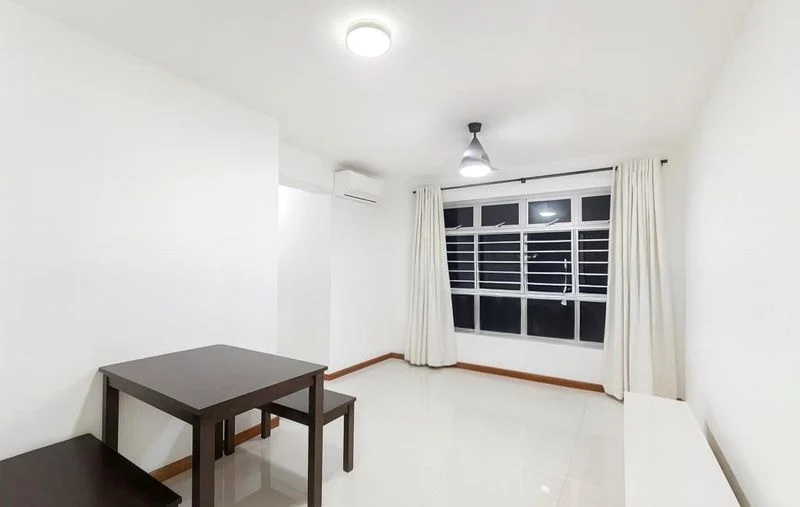 Step into this stylishly renovated HDB flat and be greeted by an inviting open-concept living space that exudes a modern industrial charm. The moderate natural light filters through, highlighting the unique bicycle-themed pendant light and decorative wall art, creating an ambiance that feels both contemporary and warm. The living room seamlessly flows into the dining area, where a long wooden table paired with metal chairs invites gatherings and shared meals.