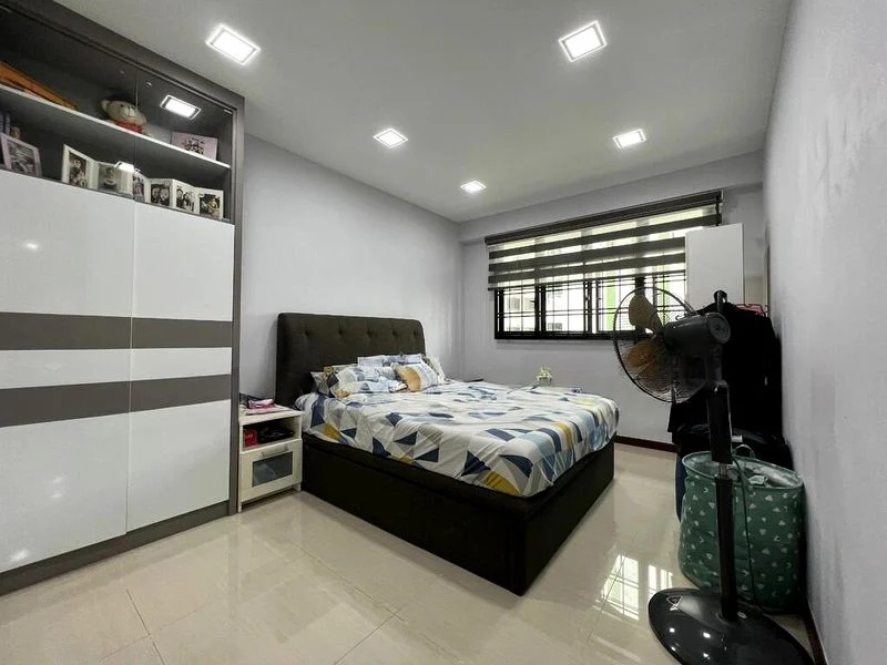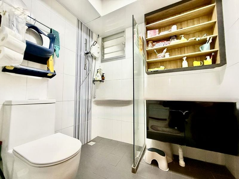 This efficient 3-bedroom, 2-bathroom layout features standout elements including a fully-furnished master bedroom with an en-suite bathroom, complete with modern grey and white tiling and a sliding shower partition. The kitchen boasts sleek black cabinetry and an integrated microwave niche, perfect for culinary enthusiasts. Additional conveniences include a household shelter for storage and a service yard equipped with a washing machine, enhancing practicality for everyday living.