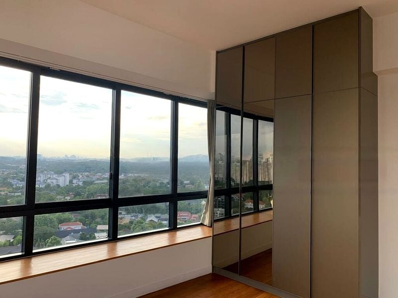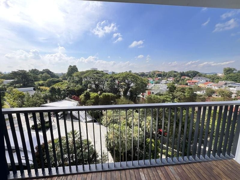 Step into a bright and airy sanctuary at D'LEEDON, where abundant natural light floods the open-concept living area through floor-to-ceiling sliding doors. The large balcony, adorned with wooden decking, invites you to unwind while soaking in panoramic views of lush greenery and low-rise residential surroundings.