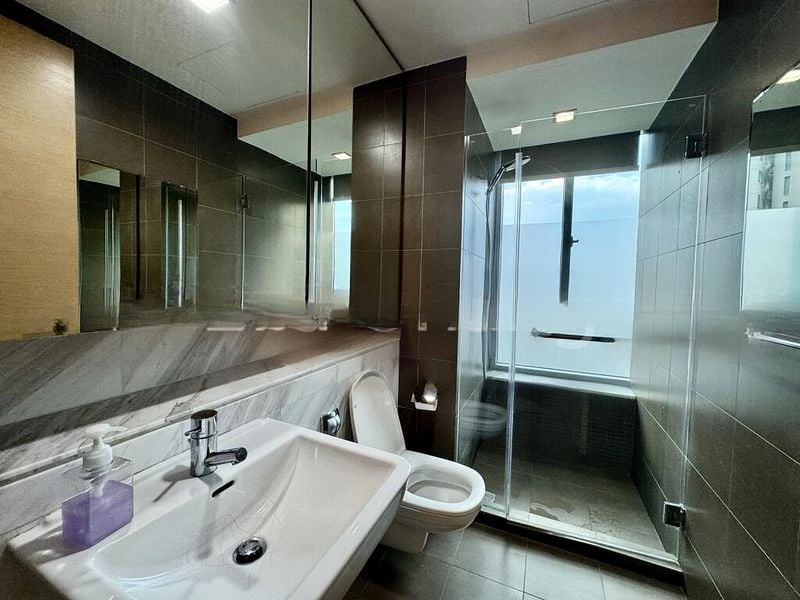 Step into a bright and airy haven at Domain 21, where abundant natural light floods through floor-to-ceiling windows, offering stunning views of the city skyline. The polished tile flooring and recessed lighting create an inviting ambiance, making every corner feel spacious and welcoming. Sliding glass doors lead to a balcony, perfect for enjoying the urban landscape.