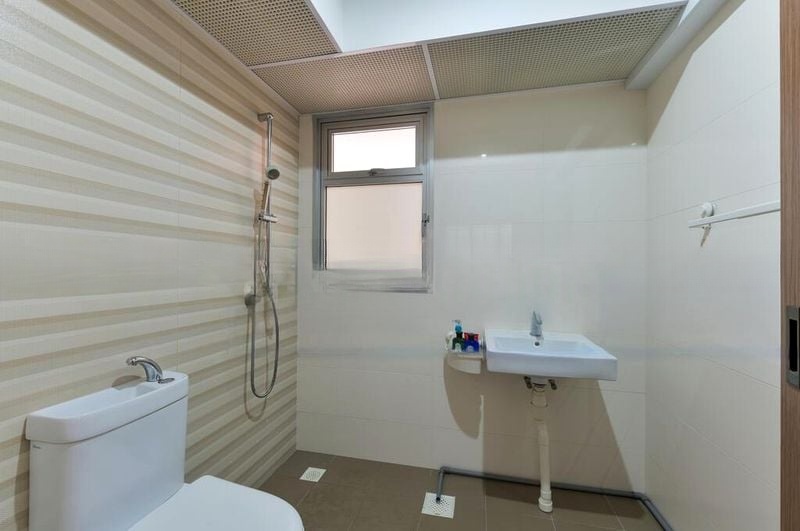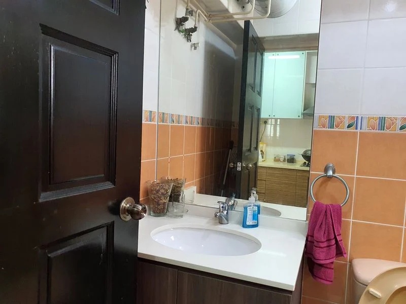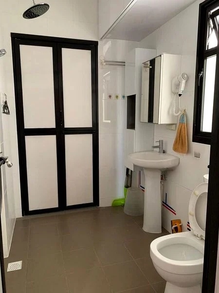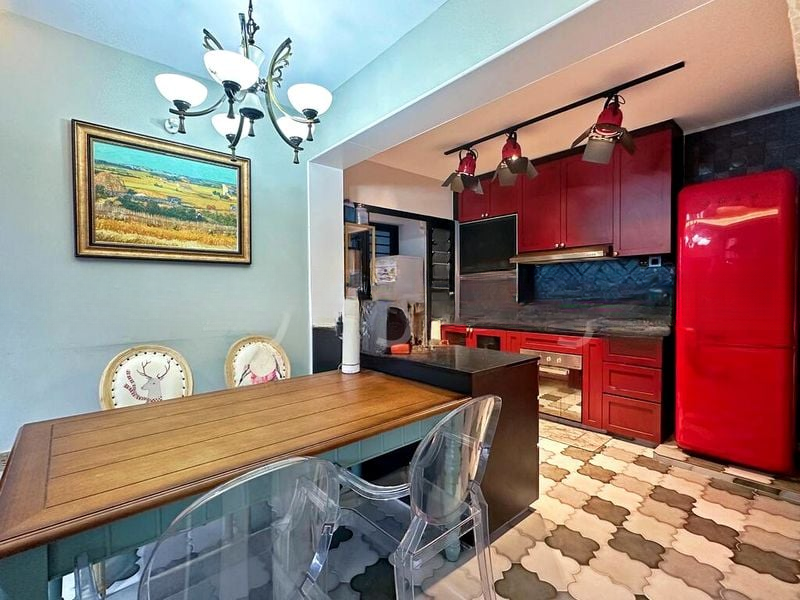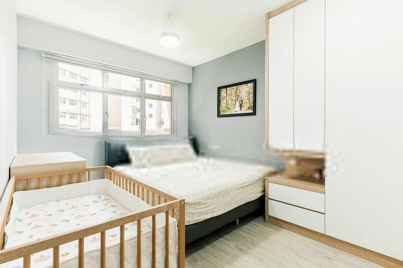 Step into this beautifully renovated 4-room flat and feel the warmth of abundant natural light cascading through the open-concept living and dining area. The modern minimalist ambiance is accentuated by cove lighting and designer pendant lights, creating an inviting atmosphere. Enjoy views of the serene residential surroundings while relaxing on the plush L-shaped sofa or gathering around the elegant marble-top dining table.