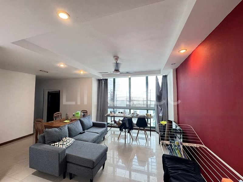 Step into a bright and airy sanctuary where abundant natural light floods through the floor-to-ceiling windows, creating a warm and inviting ambiance. The open-plan living and dining area, accentuated by a striking red feature wall and modern false ceiling with downlights, offers a perfect blend of style and comfort, while the urban estate view adds a dynamic backdrop to your everyday life.