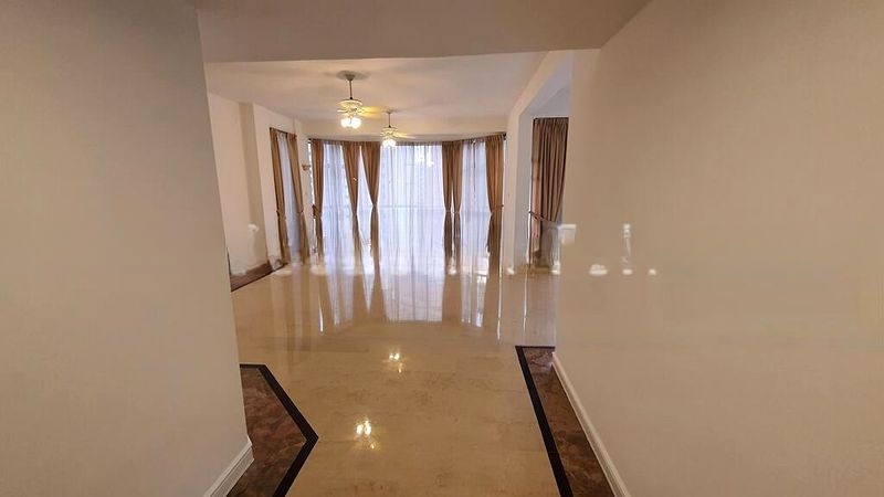 Step into a world of elegance as you enter this well-maintained 4-bedroom unit at Leonie Condotel. The abundant natural light floods the spacious open-plan living and dining area, accentuating the polished marble flooring with its striking dark border inlay. Large sliding glass doors lead to a generous balcony, offering unblocked views of the shimmering swimming pool, lush greenery, and the vibrant city skyline.