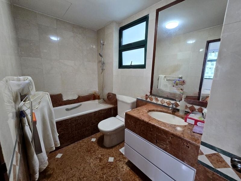 This thoughtfully designed 2-bedroom, 2-bathroom unit boasts an open-plan layout, seamlessly connecting the living, dining, and kitchen areas. The kitchen is a chef's delight with glossy cream cabinets, a stylish tiled backsplash, and modern stainless steel appliances. Each bedroom is equipped with large floor-to-ceiling built-in wardrobes, providing ample storage, while the study desk in the master bedroom offers a perfect nook for productivity.