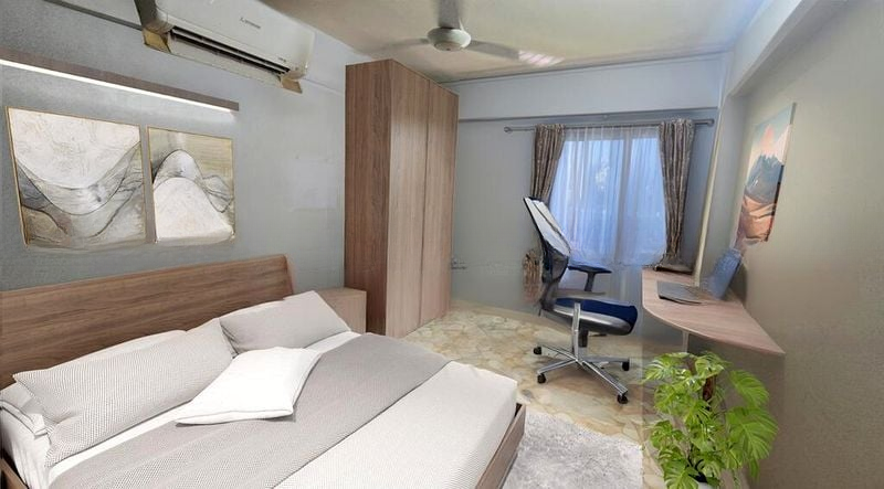Step into this inviting 2-bedroom flat, where a marble-patterned TV feature wall greets you, complemented by a cozy ambiance created by recessed lighting and a hanging swing chair. The tiled flooring and moderate natural light enhance the warmth of the living space, making it a perfect retreat for relaxation.