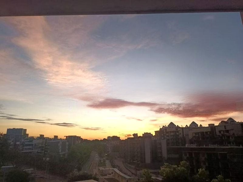 Step into a bright and airy sanctuary where polished marble flooring meets floor-to-ceiling windows, inviting abundant natural light and offering stunning views of the city skyline and lush greenery. The high ceilings enhance the spacious ambiance, creating an inviting atmosphere that feels both modern and sophisticated.