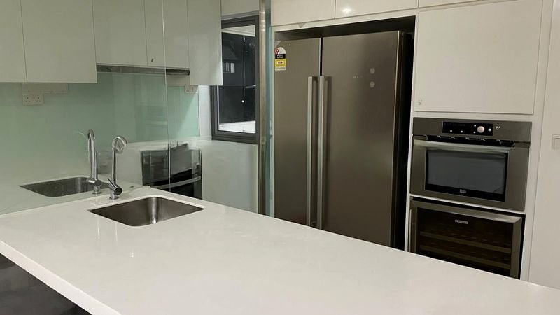 This well-maintained 3-bedroom, 3-bathroom unit boasts an open-concept layout, featuring a stunning island kitchen equipped with a double sink, built-in oven, and wine chiller. The living area is perfect for entertaining, with an L-shaped leather sofa and a chic marble coffee table. Retreat to the tranquil bedrooms adorned with wood parquet flooring, and indulge in the luxurious bathrooms featuring rain showers and elegant black marble tiles.