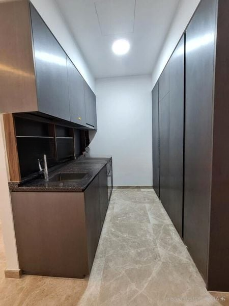 This well-maintained 1-bedroom unit features a stylish living room with marble-look floor tiles and pendant lighting, seamlessly flowing into a modern kitchen equipped with dark grey cabinetry, granite-look countertops, and built-in appliances. The bathroom is a luxurious retreat, showcasing grey stone-look tiles, a wall-hung toilet, and a sleek glass shower partition, ensuring both comfort and elegance.