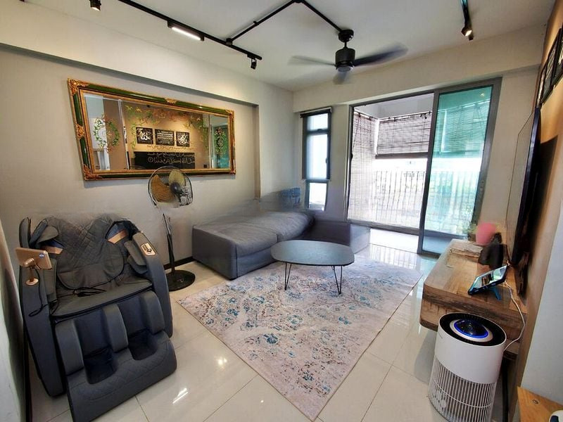 Step into a warm and inviting space where natural light dances across the well-maintained interiors of this 3-bedroom flat. The cozy ambiance is accentuated by modern finishes, including track lighting and an ornate mirror in the living room, creating a perfect blend of comfort and style. Sliding doors lead to a balcony adorned with bamboo blinds, offering an unblocked view of lush greenery and the nearby park, making it an ideal spot for relaxation.