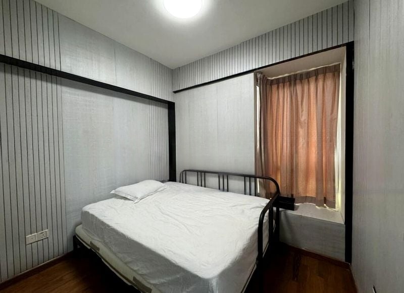 Step into a serene oasis at Mount Sophia Suites, where modern minimalist design meets comfort. The well-maintained unit greets you with moderate natural light filtering through floor-to-ceiling curtains, illuminating the stylish living room adorned with a chic chandelier and floral wall art. The balcony offers a refreshing view of lush greenery, creating a tranquil ambiance perfect for relaxation.