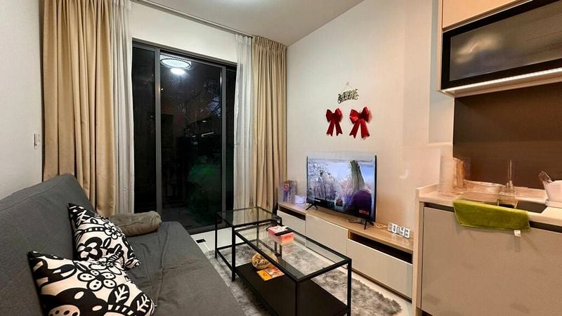 Step into a world of elegance and comfort in this beautifully renovated 1-bedroom unit at Sophia Hills. The moment you enter, you are greeted by abundant natural light cascading through large windows, illuminating the open concept living and dining area. The polished tile flooring and modern designer lighting create a bright and airy ambiance, while the glass sliding doors lead you to a private balcony overlooking the lush greenery and serene swimming pool.