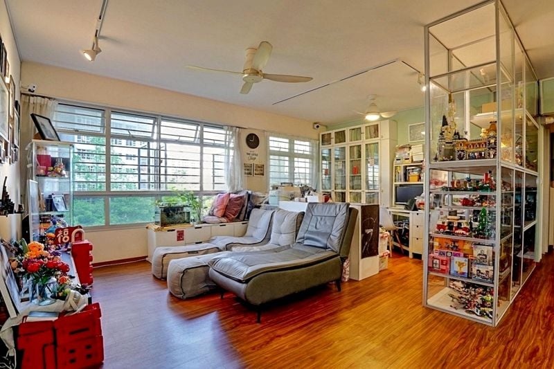 Step into a beautifully renovated HDB flat that exudes modern elegance and warmth. The open-concept living area greets you with its wooden flooring and large windows, allowing natural light to filter through while framing serene views of lush greenery. Custom floor-to-ceiling glass display cabinets add a touch of sophistication, creating an inviting ambiance that feels both organized and stylish.
