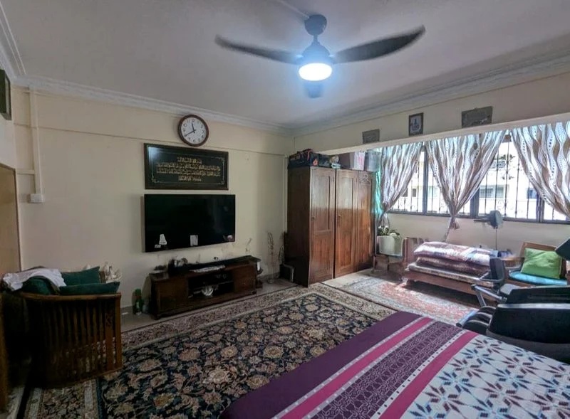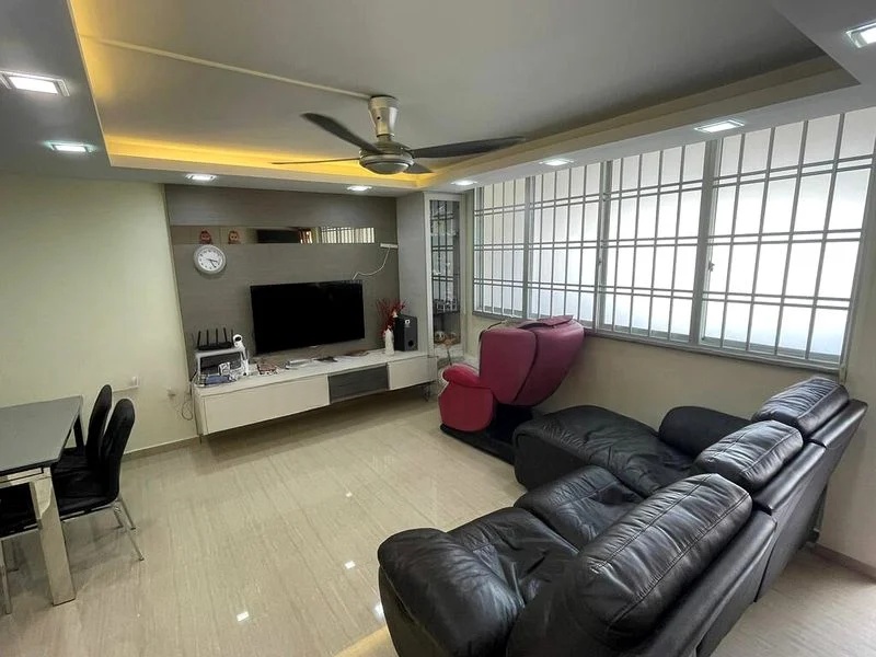 Step into this inviting HDB flat where cozy warmth meets modern design. The living room greets you with a grey fabric sofa and an accent wall featuring stylish shelving, complemented by a large window that fills the space with natural light. The urban view adds a vibrant backdrop, making it a perfect spot to unwind.