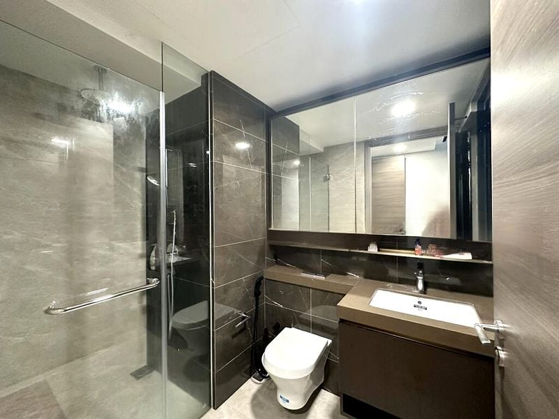 This thoughtfully designed unit boasts a dedicated dual-workstation study room, ideal for remote work or study sessions. The modern kitchen is equipped with integrated appliances and dark grey cabinetry, complemented by a stylish marble-patterned backsplash. The bedroom offers a serene retreat with a striking feature wall, blackout curtains, and a plush dark grey upholstered headboard, ensuring restful nights.