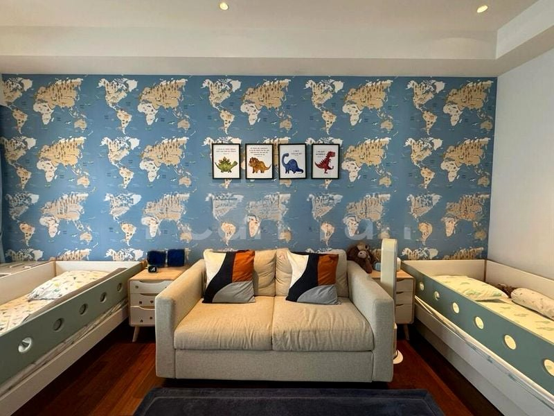 This expansive 7000 sqft unit boasts an open concept layout that seamlessly connects the living and dining areas, perfect for entertaining. The gourmet kitchen features high-end finishes, while the indoor-outdoor bathroom concept offers a unique shower experience surrounded by nature. Each of the six bedrooms is thoughtfully designed, including a kids' room adorned with world map wallpaper and playful dinosaur art, ensuring a perfect blend of style and functionality.